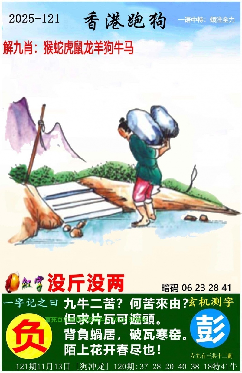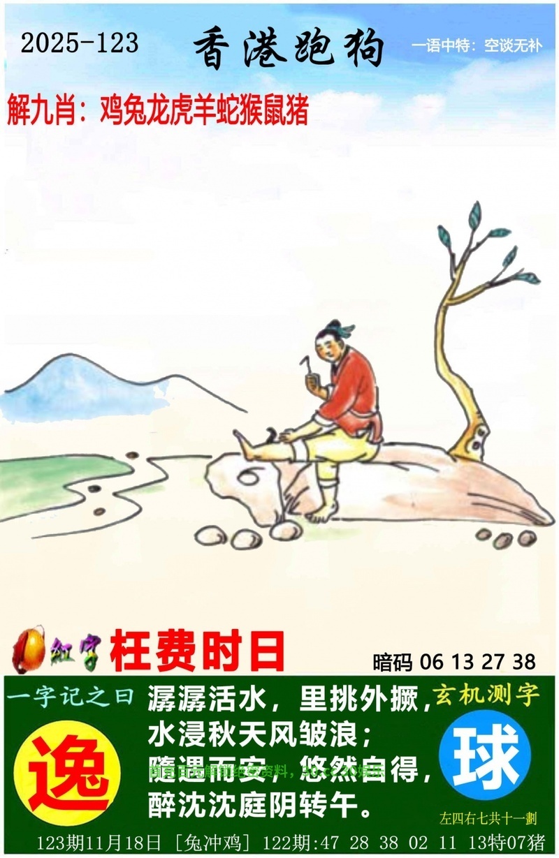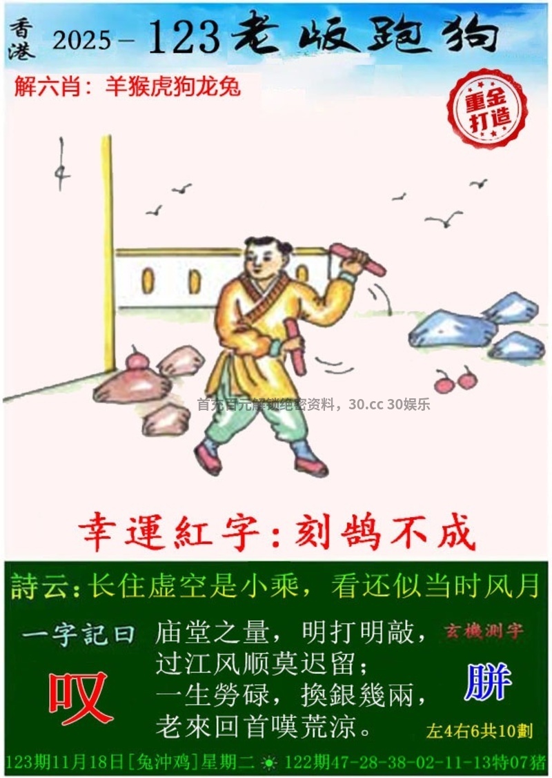 解释:唐史上头功第一,功第一解虎肖,原脱长裾学少年,学少年解鸡肖,江花江草为谁芳,江花江草解蛇肖,自知休沐诸幽胜,诸幽解猪肖,身才稍稍六尺一,六尺解鼠肖,去年断酒到今年,断酒解猴肖。