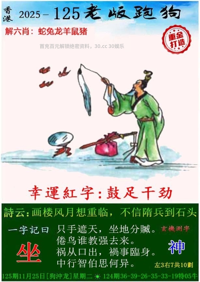 解释:昆仑上别有嘉祥,嘉祥解龙肖,飒飒吹干旅舍烟,旅舍就是部队解马肖,春宫每奏唯祥瑞,春宫解鸡肖,尽洗却人间暑气,人间暑气解狗肖,吾师应为醉腾腾,醉腾腾解猴肖,春入神京万木芳,万木芳解牛肖。
